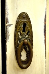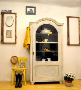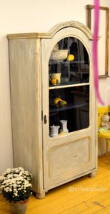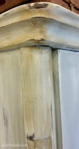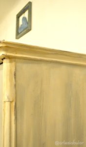 A szekrény külsejét először fehérrel festettem (Old White), majd szürkékkel “mostam” (Paris Grey és French Linen). Ezt az antikolási technikát nevezzük grey wash-nak, de valójában bármilyen színnel megtehetjük ezt. A festéket kicsit vizesebben viszem fel, majd egy ronggyal, szálirányban (ez fontos) visszatörlöm. Mindezt addig ismételgetve, míg a kívánt színt, felületet meg nem kapom.