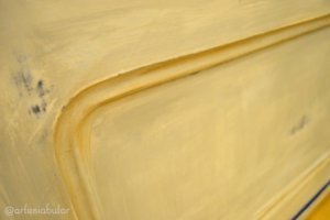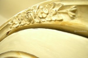 A “szürkézés” után egy pici aranyozást még itt-ott kívánt, melyet főként a mintákra, mélyedésekre tettem. Ehhez a Pentart arany akrilját használtam. Majd persze az elmaradhatatlan csiszolás, amelytől kopottassá tesszük a festést. Ezért (is) szeretem a krétafestéket, mert annyira könnyű visszacsiszolni, hiszen a smirgliszivaccsal egy-két jól irányzott mozdulat és már kész is.