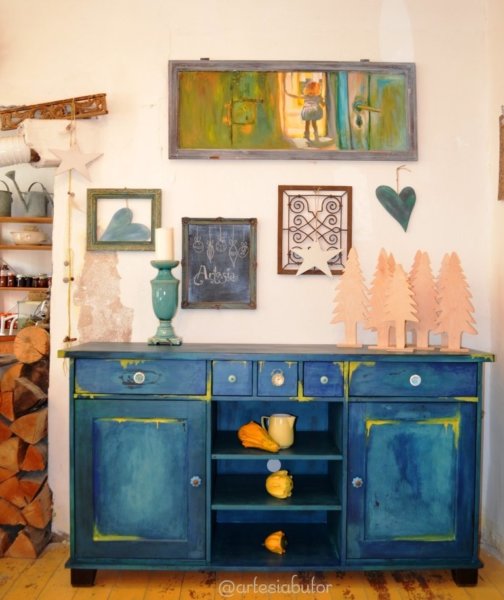 Nagyon vágytam már valami SZÍN festésére … mert bár nagyon szeretem a szürkéket, fehéreket és tudom, hogy sokaknak a vintage színe ez, azért a lelkem belül inkább bohém és mint ilyen, kívánom a színeket. Most pedig egy ideje a kékeket nagyon. Nem terveztem meg előre, csak úgy, érzésből szerettem volna … zenehallgatás mellett … a sparheltben lobogó tűznél … minden mást kikapcsolva a fejemben … örömből. Szóval kipakoltam Annie néni kékjeit (és melléjük csempésztem pici pikantériaként egy kis zöldeset és – ahogy valaki írta a Facebookon kommentben – poénként a sárgát.)