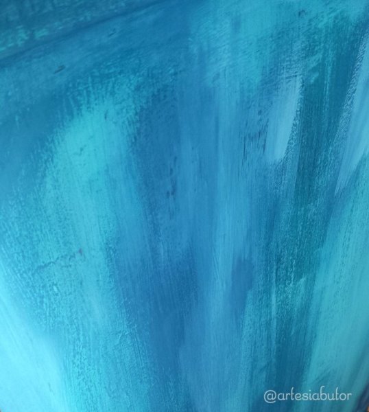 A Florence színből volt a legtöbb a dobozban, így amellett döntöttem alapként. Ez inkább zöld, mint kék, de jó kiemelést ad a kékeknek. Aztán elkezdtem ecsettel, szivaccsal és persze az ujjaimmal itt ott, foltokban belevinni a kékeket, rétegekben egymásra. Jaaaj, nagyon élveztem! <3