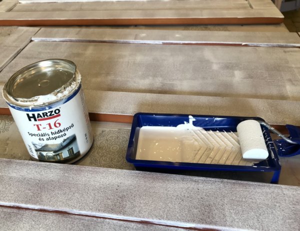 Miután elértem a sík felületet, alapozással kezdtem, Harzo T-16-tal. Nem feltétlen kell, sokan így tartják. De konyhabútorhoz, 4 gyereknél, a jobb tapadás miatt én inkább biztosra mentem. Hengerrel vittem fel, jó alaposan.