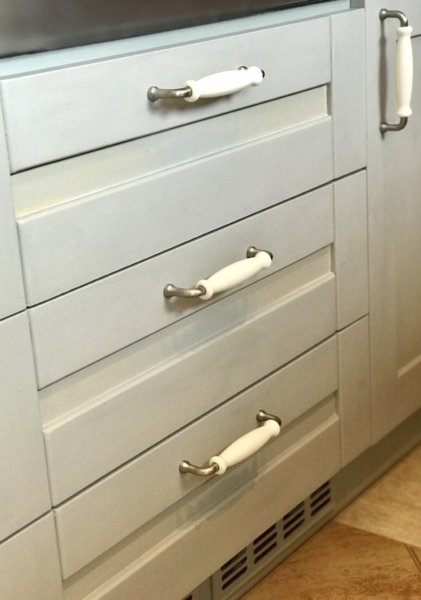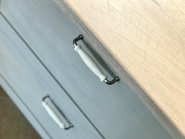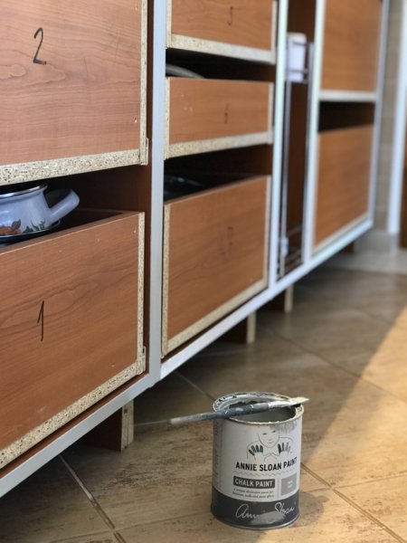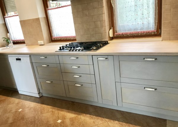 Mivel az általunk választott új munkalap gyönyörű faerezetes és egy nagyon szép drappos alappal bírt, ezt a drappos színt valahogy szerettük volna viszontlátni a frontfelületekben is. Így a kazettákba (mélyedésekbe) belemostam egy kicsit ezt a színt a szürkébe. A választott szín hozzá Annie Sloan Country Grey lett. Persze minden lap más, de ez teljesen tudatos, hiszen egyben úgyis nagyon szép egységet alkot.